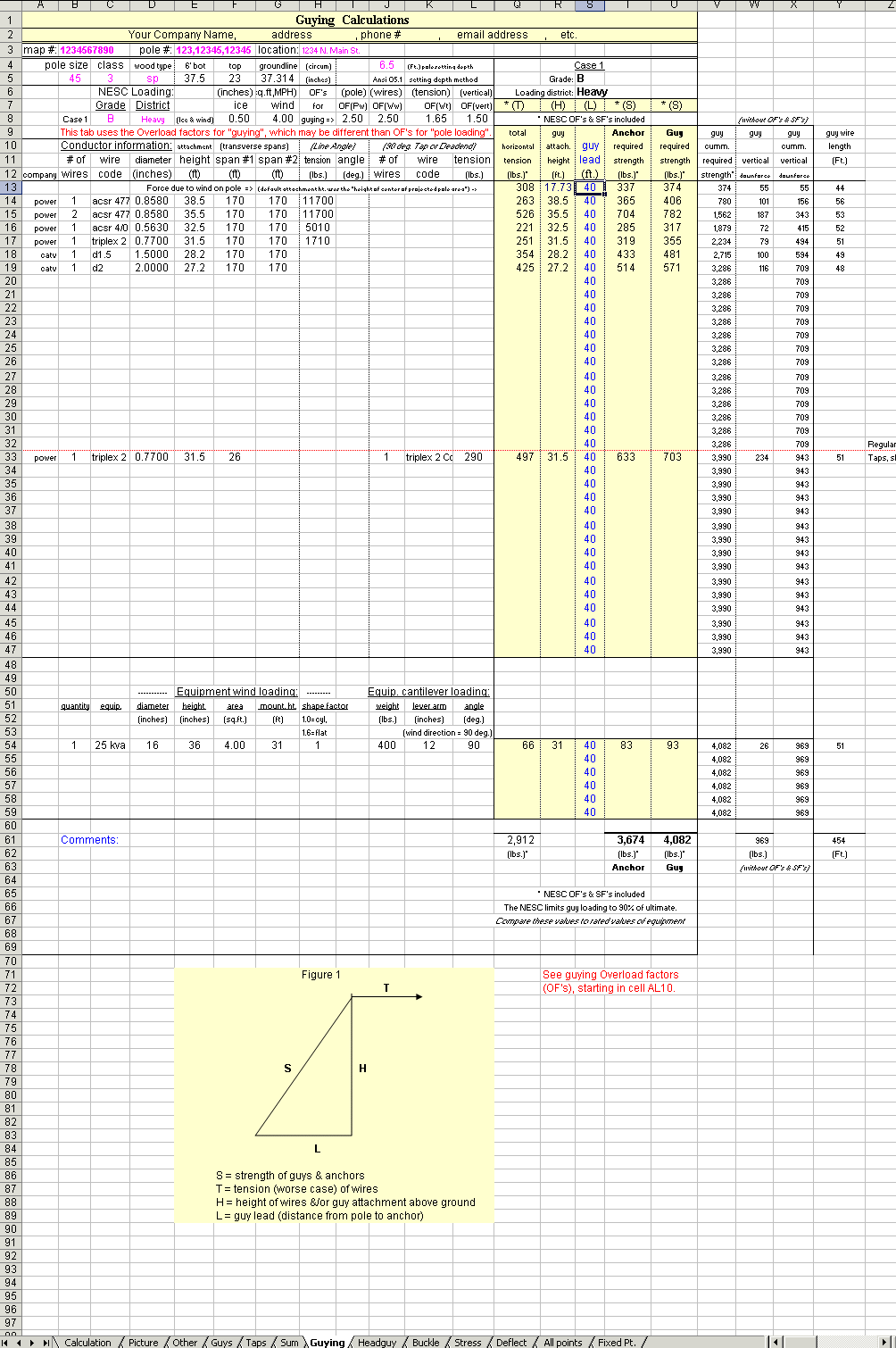 | Calculates required guys and anchors using NESC or GO95 overload factors, pole data, wire size, tension, span lengths, deadend tensions, line angles, transverse wind & ice loading. (NEW =>) A new headguy tab calculates required headguys between two poles, and downguys on the second pole, all at the same time. An alternate method of modeling guy wires is also available. The guys tab allows a user to enter existing or proposed guy information, to model their effect on pole loading (transverse & vertical). The results of the forces & moments due to these guy wires are transferred to the calculation, sum, and buckle tabs. The Guying program requires the Transverse & Vertical Pole Loading program. It is not available as a stand-alone program. |